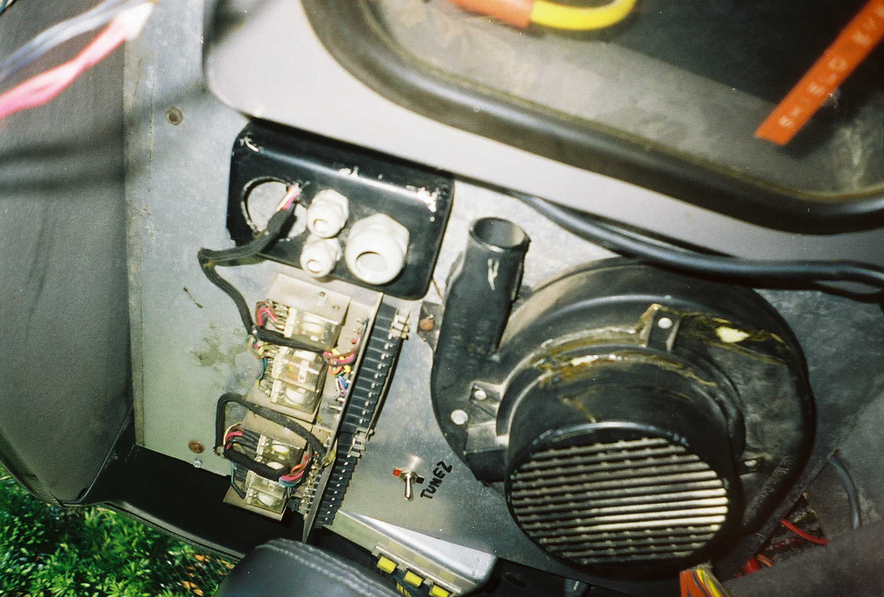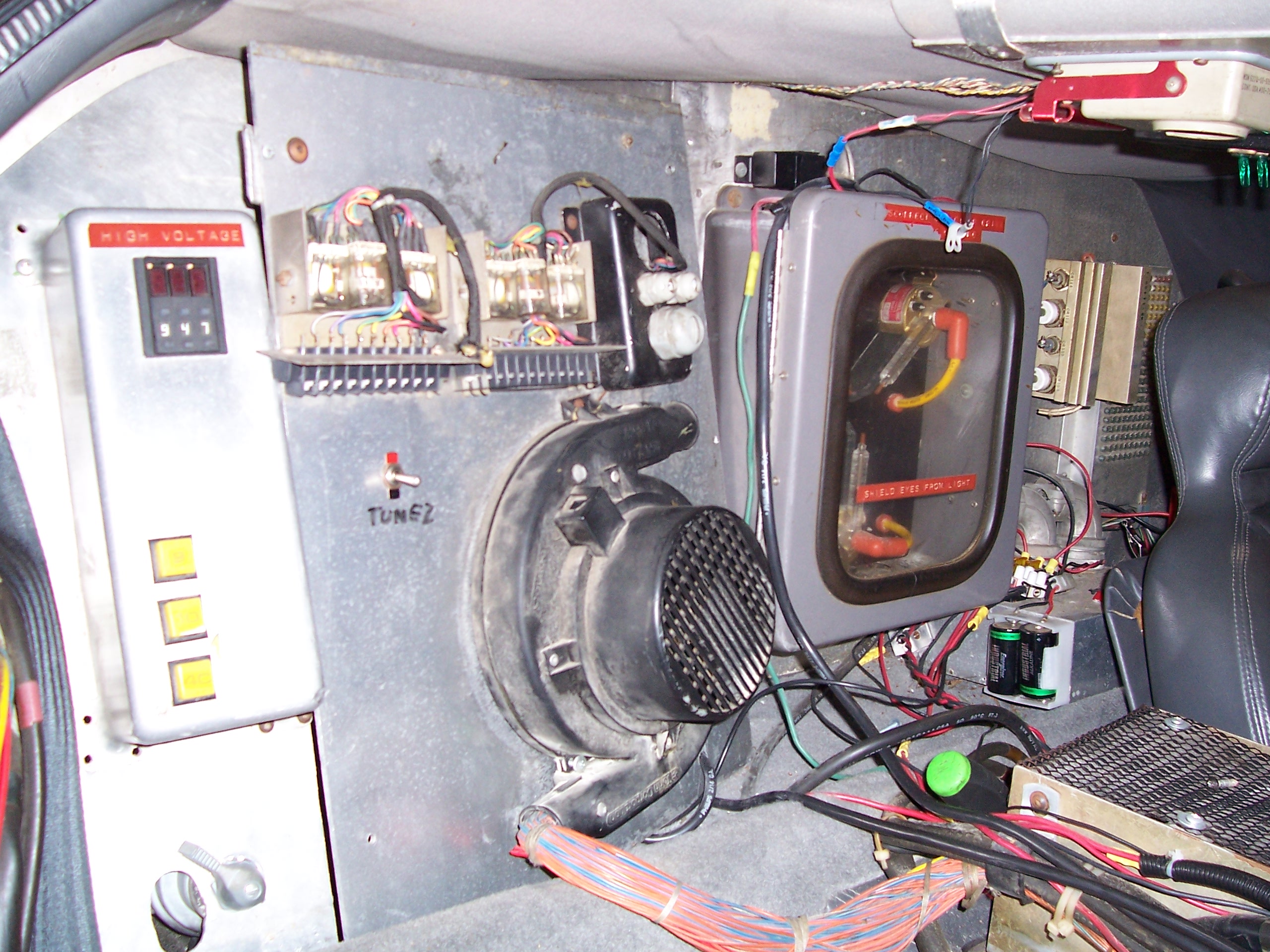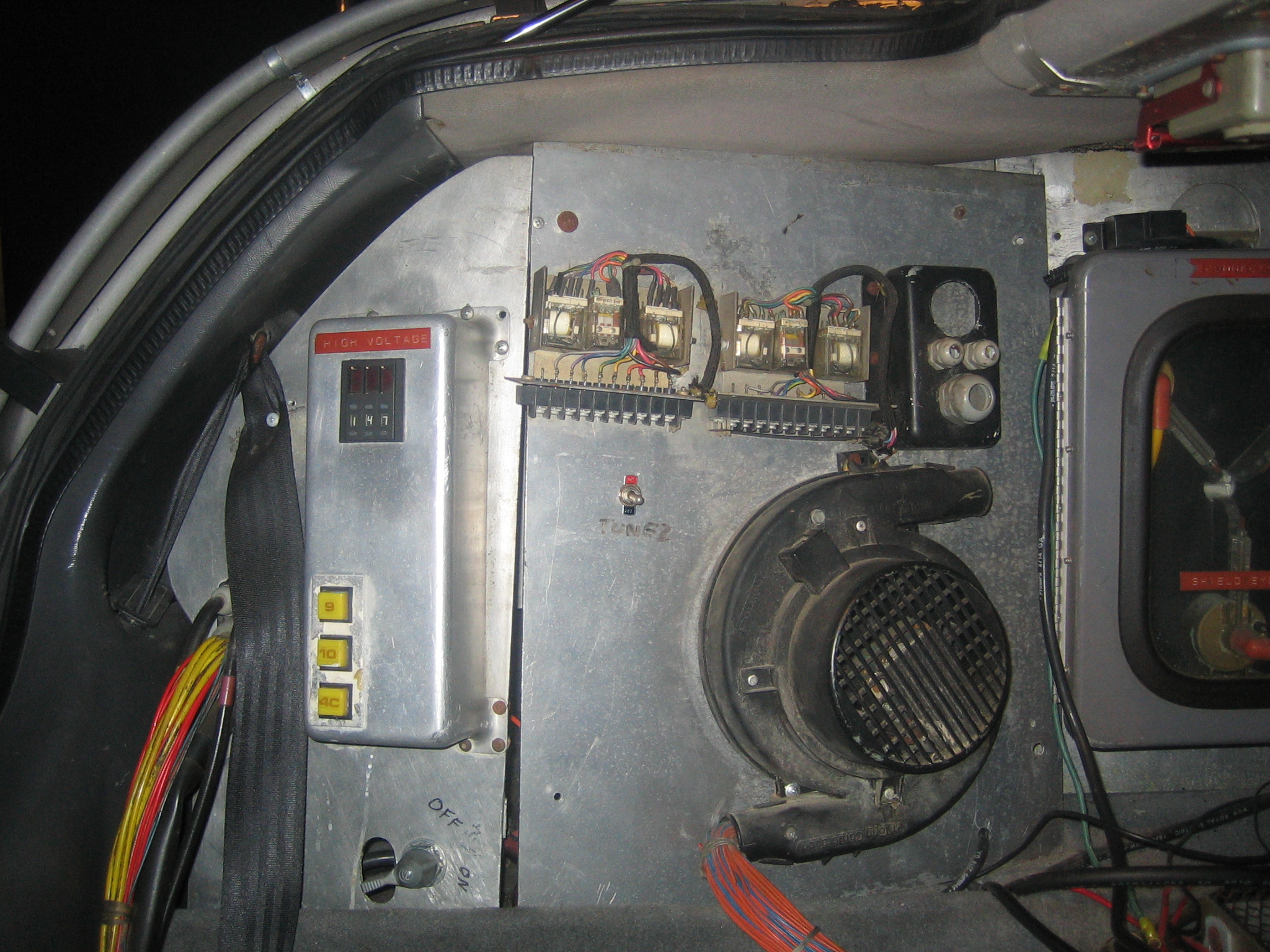 The Torin Blower sits in between the VSR & Flux Capacitor, behind the passenger seat of the Delorean Time Machine. Below are a bunch of pictures of the Torin Blower on the a-car