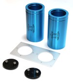The 2 blue capacitors are CNC’d from a solid block of aluminum and come with plastic interiors and threaded inserts and bolts to attach them.Â