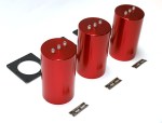 The red capacitors are CNC’d from a solid block of aluminum and come with 3 white standoffs and bolts to attach them.